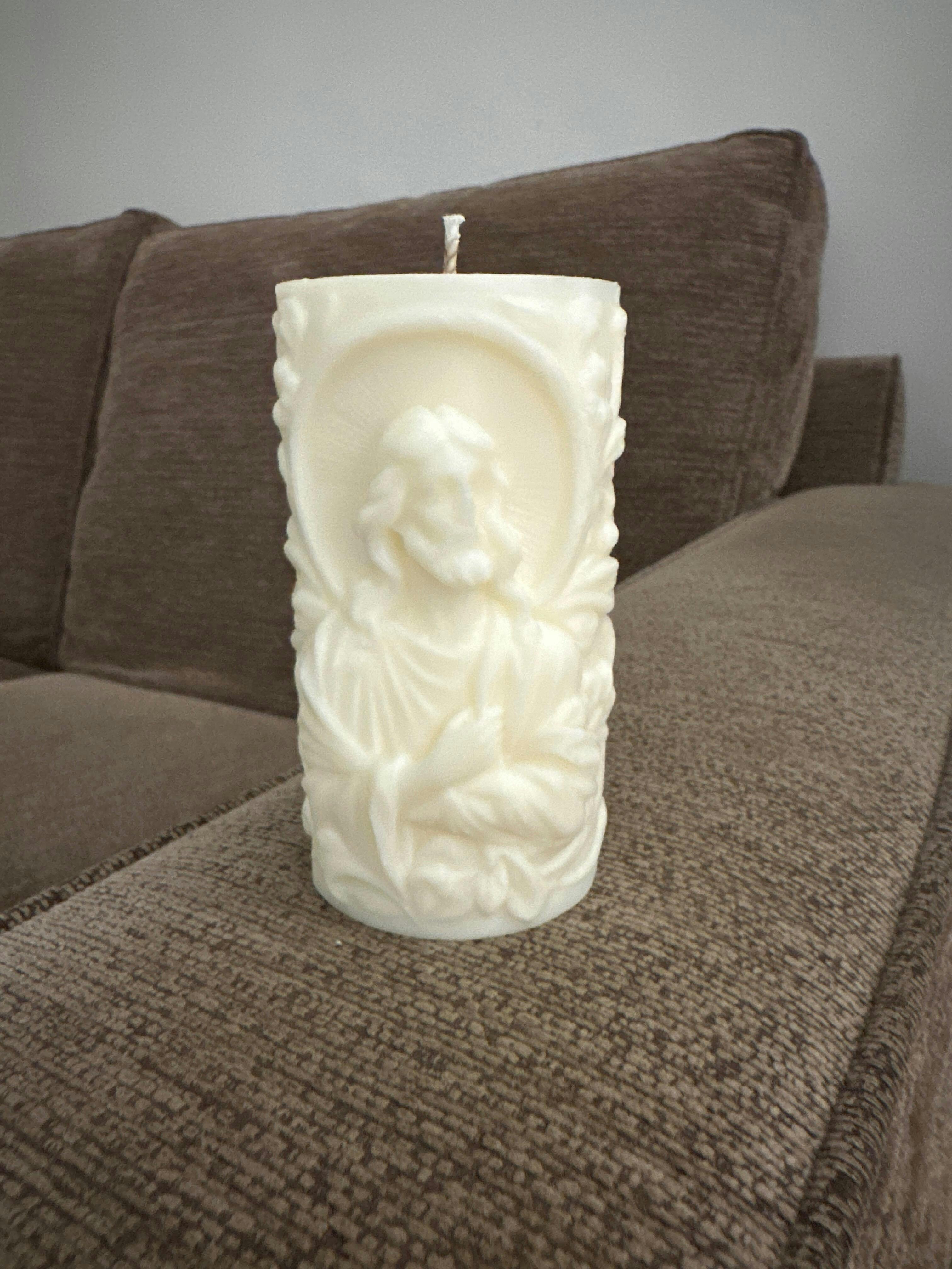 Featuring an intricately embossed image of Jesus, this pillar candle is more than just a source of light—it's a meaningful addition to your prayer corner, meditation space, or home altar. Each candle is lovingly crafted to preserve every delicate detail, creating a serene focal point for moments of devotion and contemplation.